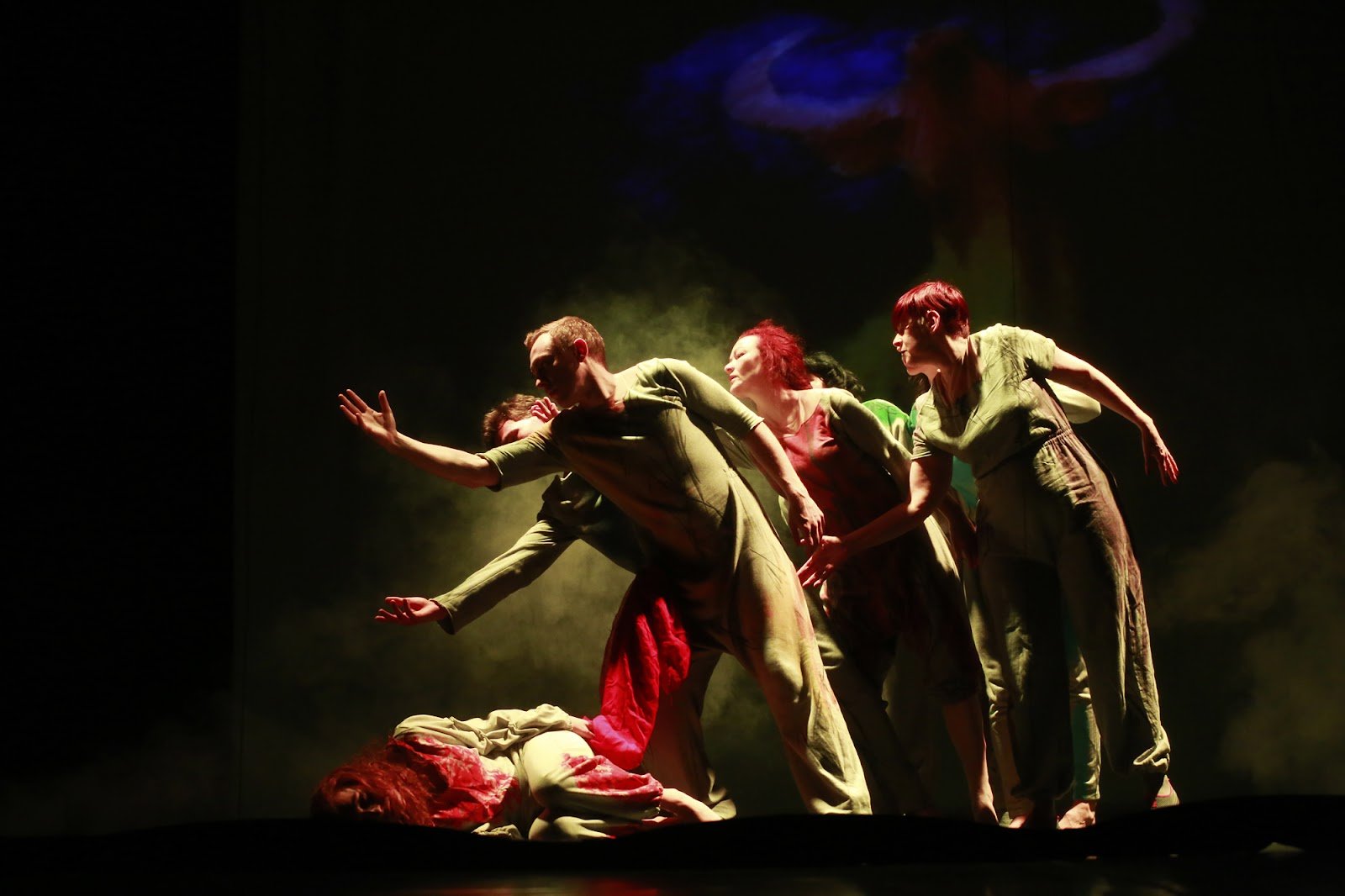 Тифлокомментарий: на сцене полумрак. На полу лежит девушка с рыжими волосами, прижимает колени к животу. Остальные стоят рядом, чуть наклонившись вперед, протягивают к ней руки. Их освещают лучи красного и зеленого света.