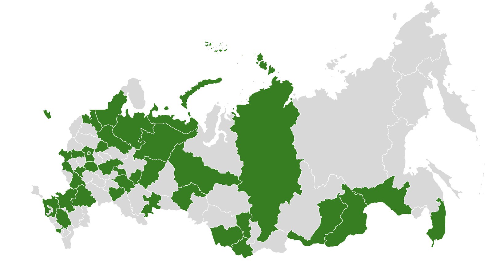 Тифлокомментарий: цветная карта России. Зеленым цветом обозначены регионы, где действует система «Говорящий город». Остальная территория окрашена в серый цвет.