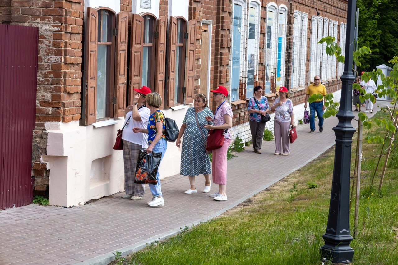 Тифлокомментарий: цветная фотография. Лето. Индивидуальная экскурсия по улицам старого Сарапула. Гиды-волонтеры и экскурсанты идут попарно вдоль ряда кирпичных домов с распахнутыми ставнями. Гиды в красных бейсболках и с красными сумками через плечо что-то рассказывают туристам, активно жестикулируют.