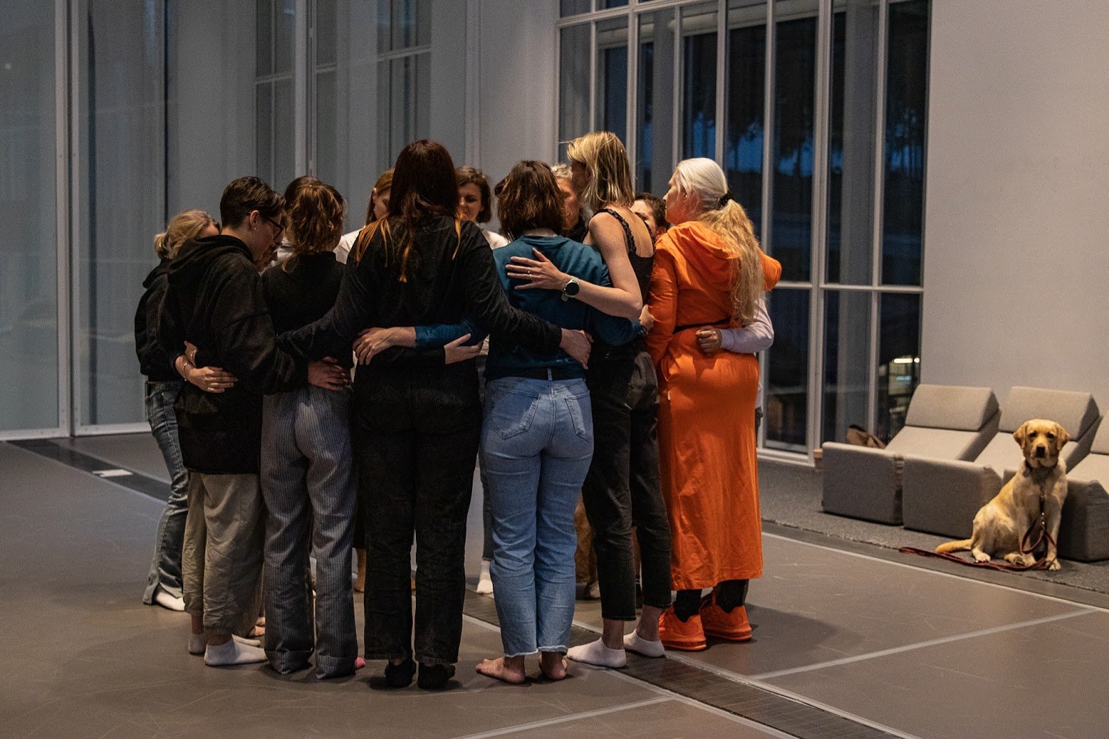 Тифлокомментарий: цветная фотография. В просторном помещении девушки, женщины и ребята встали в круг и обняли друг друга за талию. На них простая повседневная одежда и нет обуви. Недалеко от них, у дивана, смирно ждет своего хозяина собака породы лабрадор.
