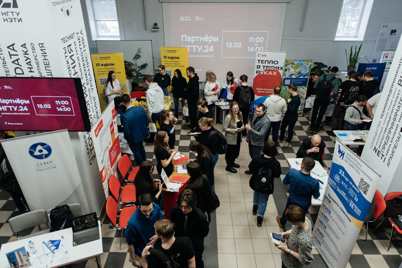 Тифлокомментарий: цветная фотография. Ярко освещенный выставочный зал с серыми стенами заполнен людьми в повседневных одеждах. Вдоль стен стоят разноцветные баннеры с логотипами разных программ и столы их представителей. На дальней стене висит экран для проектора. На нем красная заставка с белой надписью «Партнеры НГТУ. 24».