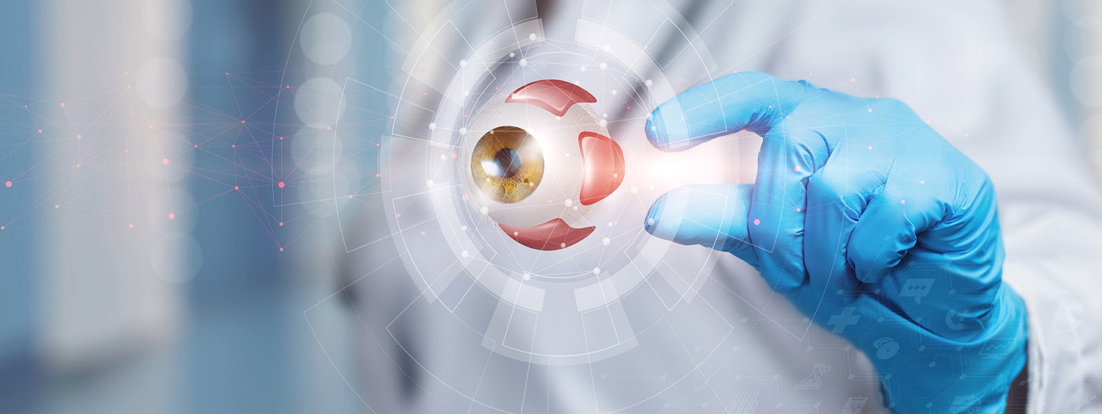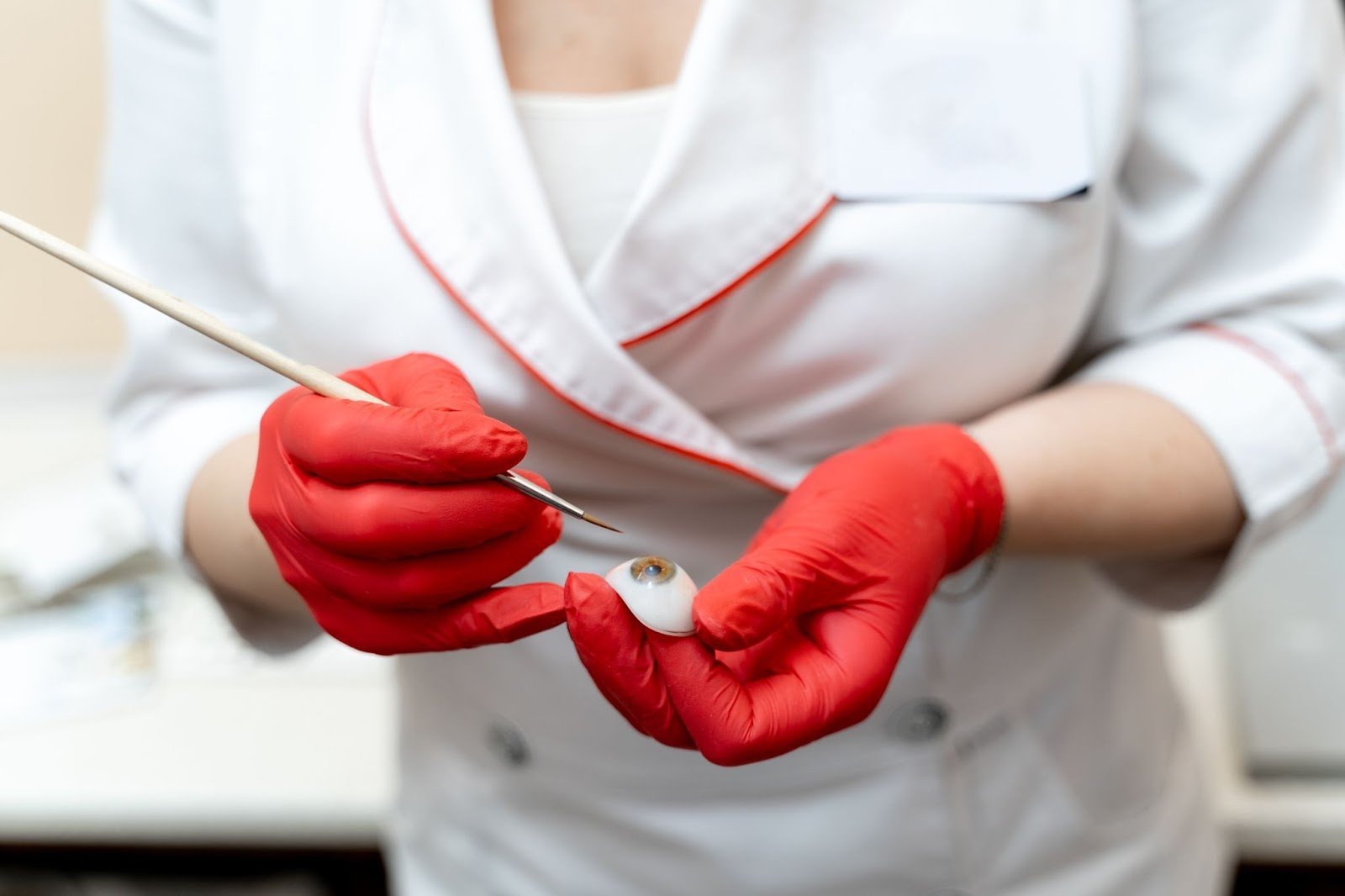 Тифлокомментарий: цветная фотография. Офтальмолог-протезист в белом халате и в красных латексных перчатках держит в руках глазной протез и тонкую вытянутую кисть.