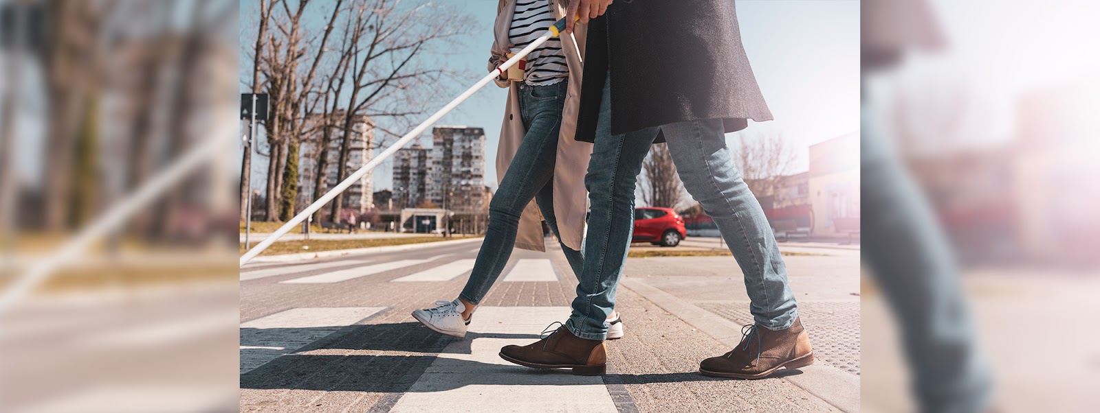 Тифлокомментарий: цветная фотография. Солнечный день в городе. Девушка с длинными светлыми волосами и юноша в темных очках и с белой тростью идут по безлюдному тротуару. Оба пьют кофе из бумажных стаканчиков, смеются. Они одеты в джинсы, плащи нараспашку, кроссовки. Девушка поддерживает молодого человека за локоть.