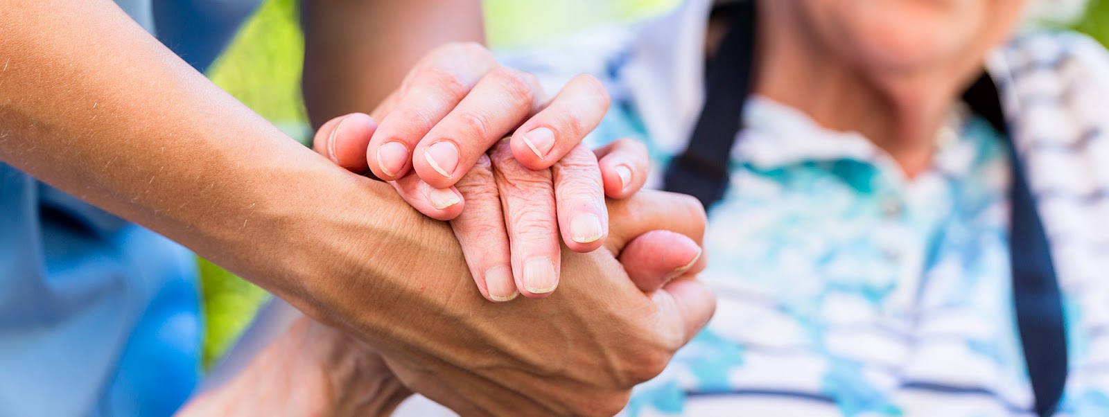 Тифлокомментарий: цветная фотография. Крупный план рук. Напротив друг друга сидят двое. Руки пожилого человека лежат в ладонях девушки.