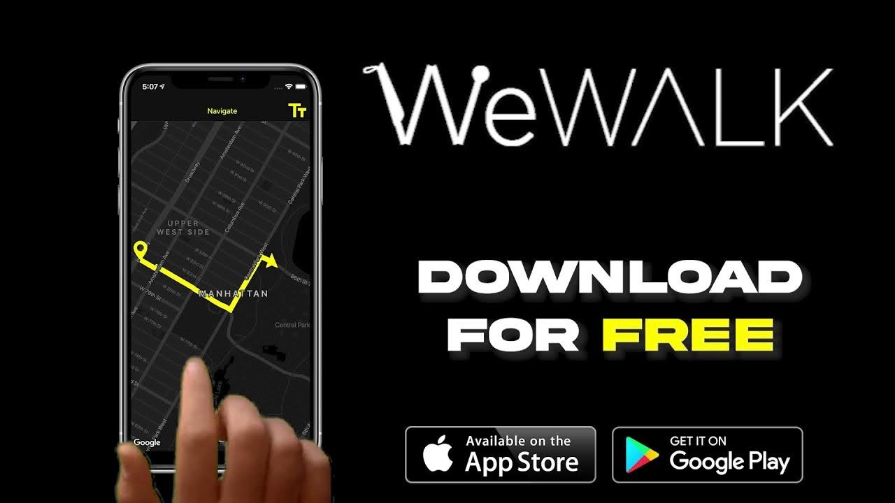 Тифлокомментарий: цветной коллаж. На черном фоне слева — смартфон. Женская рука прикасается к экрану, на котором открыт навигатор. На темной карте города желтым цветом проложен маршрут. Справа — крупные белые и желтые надписи на английском языке «WeWalk. Скачать бесплатно в App Store и Google Play».