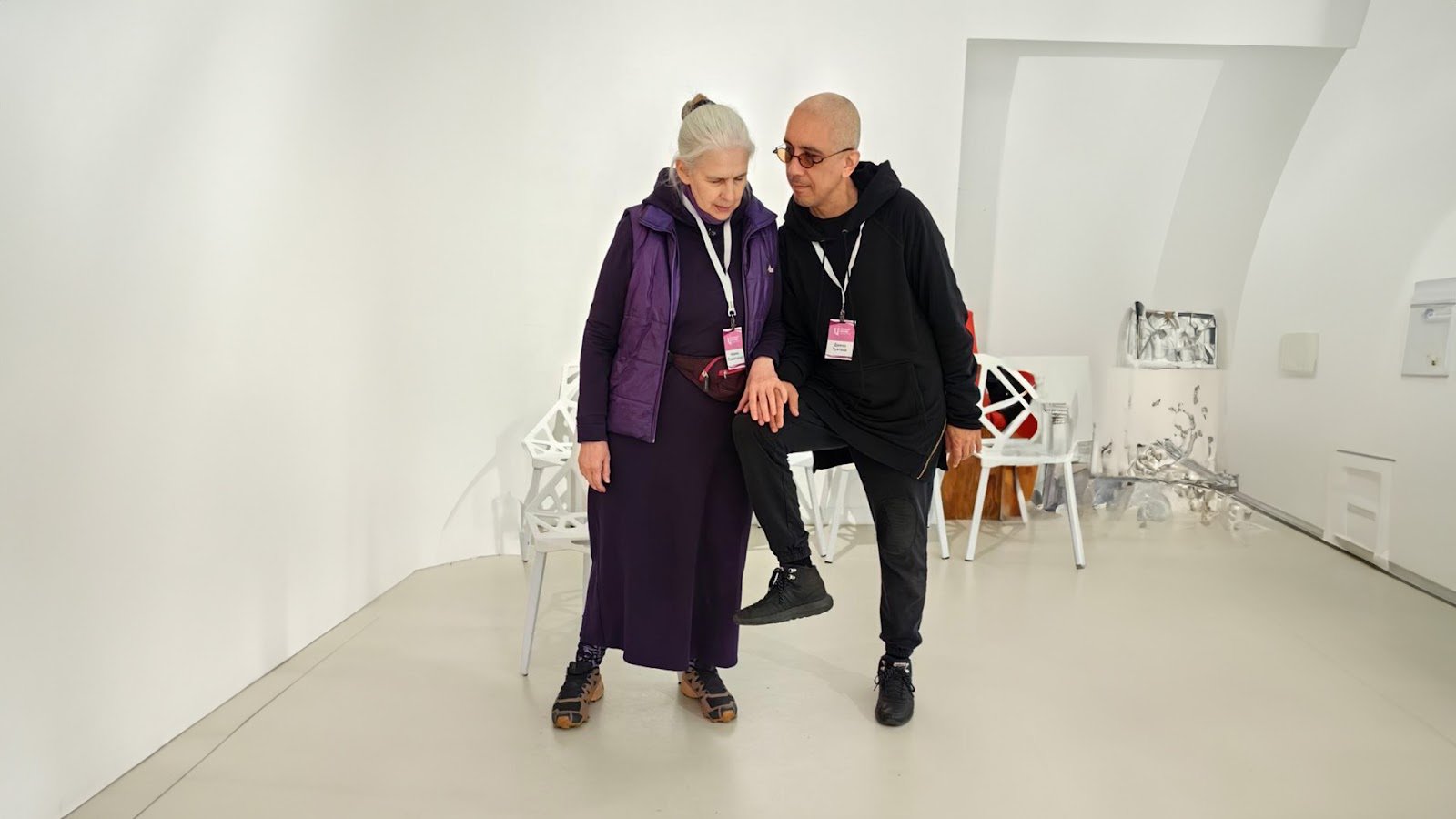Тифлокомментарий: цветная фотография. Ярко освещенное помещение с белым полом и асимметричными белыми стенами. Ирина и высокий худощавый мужчина средних лет сидят бок о бок на белой ажурной подставке. Левая ладонь Ирины лежит поверх правой кисти мужчины, их пальцы соприкасаются. Он что-то дактилирует, воспроизводит слова пальцами руки, Ирина сосредоточенно внемлет прикосновениям. На ней фиолетовые платье и жилетка, длинные светлые волосы собраны в высокий хвост. На мужчине черные штаны и худи. У обоих на груди розовые бейджики с белыми надписями «Особый взгляд».