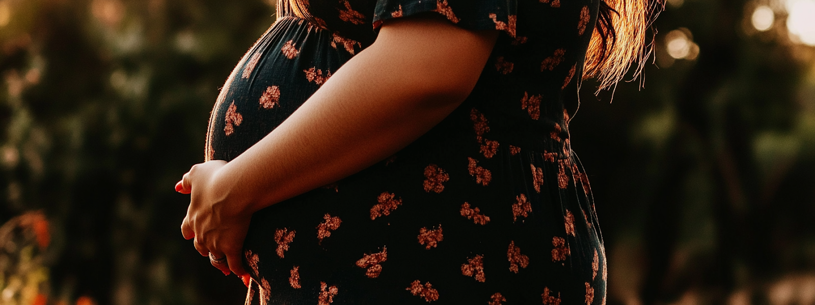 Тифлокомментарий: цветная фотография. Молодая беременная женщина в черных топике и штанах стоит перед белой занавеской, руками придерживает свой обнаженный упругий живот. На безымянном пальце правой руки — золотое обручальное кольцо.