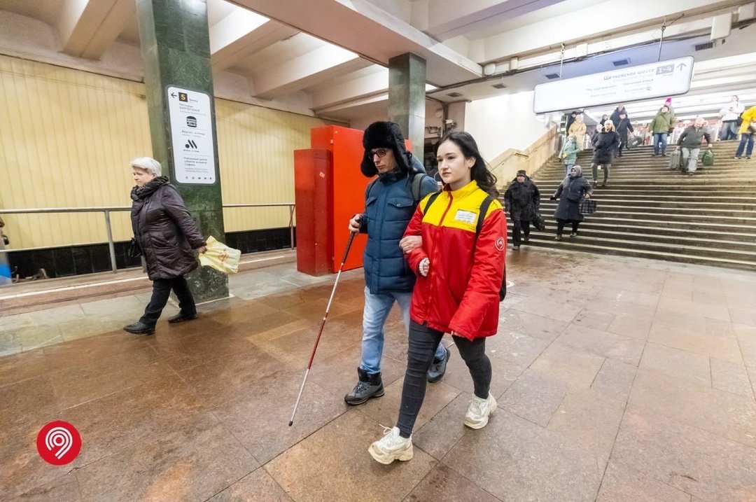 Тифлокомментарий: цветная фотография. На платформе станции Московского метро стоят пассажиры в ожидании электропоезда. На переднем плане — женщина в светлом пальто с расфокусированным взглядом держит под руку сотрудника Службы сопровождения. Это девушка плотного телосложения с длинными темными волосами в расстегнутой красно- желтой куртке.
