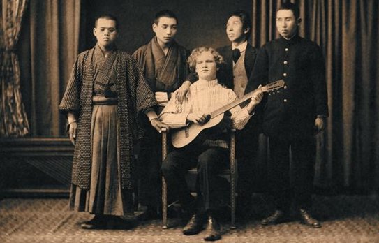 Тифлокомментарий: старинная фотография в коричневых тонах. Василий и четыре молодых японца в комнате с темными портьерами. Василий в светлой рубашке и темных брюках сидит в резном деревянном кресле, держит в руках гитару. Японцы в кимоно и сюртуках стоят полукругом позади него. Их взгляды расфокусированы.