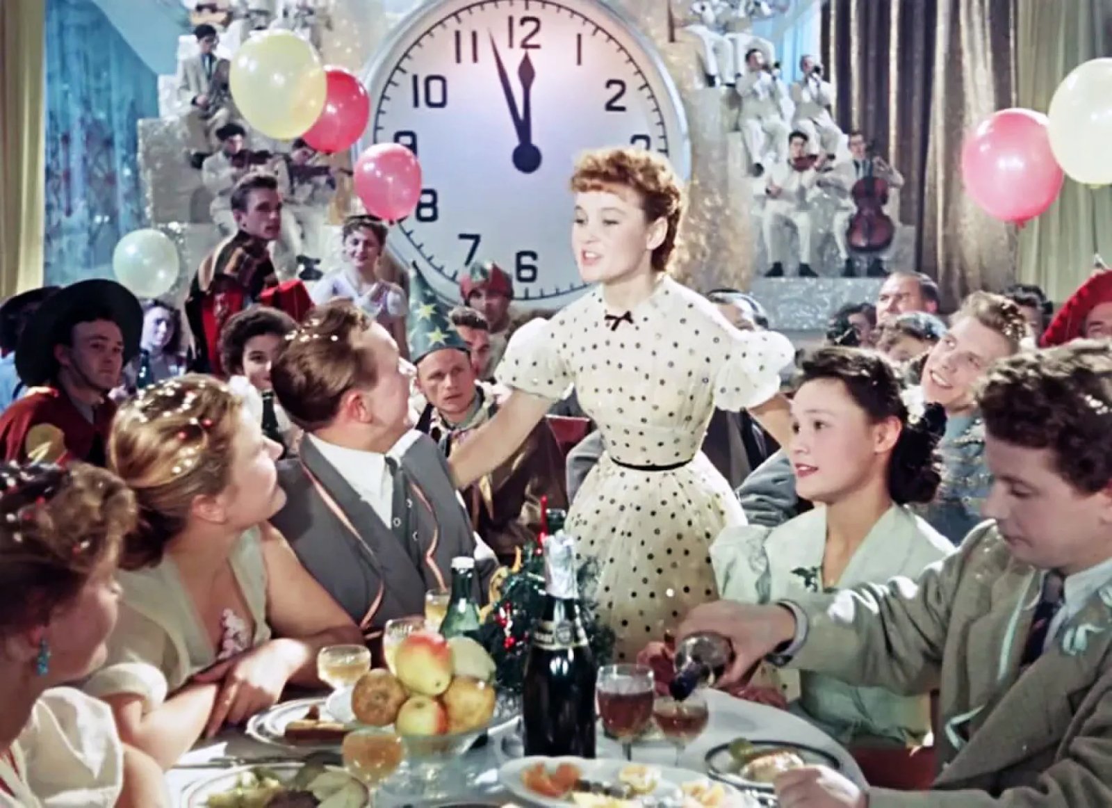 Тифлокомментарий: кадр из фильма «Карнавальная ночь». Ярко освещенный банкетный зал, украшенный мишурой и разноцветными воздушными шариками, заполнен мужчинами и женщинами в праздничных нарядах. Леночка Крылова в белом шифоновом платье, расшитым круглыми черными пайетками, ходит между столов с гостями, поет. За ней огромные круглые часы с белым циферблатом и черными цифрами, стрелки которых показывают без трех минут двенадцать.