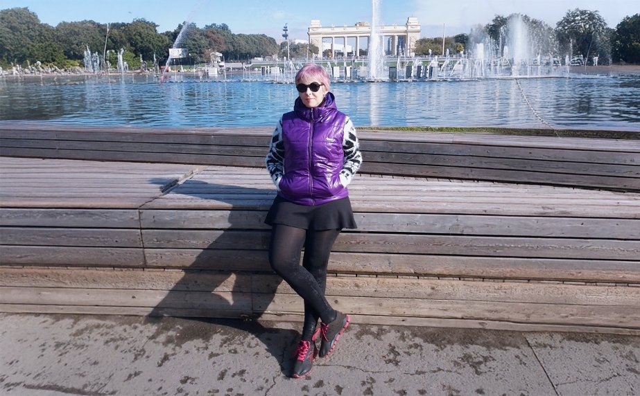 Тифлокомментарий: цветная фотография. Солнечный день в парке Горького, в Москве. На фоне центрального фонтана, опираясь на высокий деревянный помост, стоит Ирина Поволоцкая. У нее короткая стрижка, сиреневые волосы, на глазах — темные очки. Она одета в толстовку с черно-белым рисунком, фиолетовый жилет с капюшоном, короткую черную юбку, черные колготки и темные кроссовки с розовыми шнурками. За спиной Ирины возвышается монументальная арка главного входа парка с белыми колоннами, в небо взлетают струи фонтана.