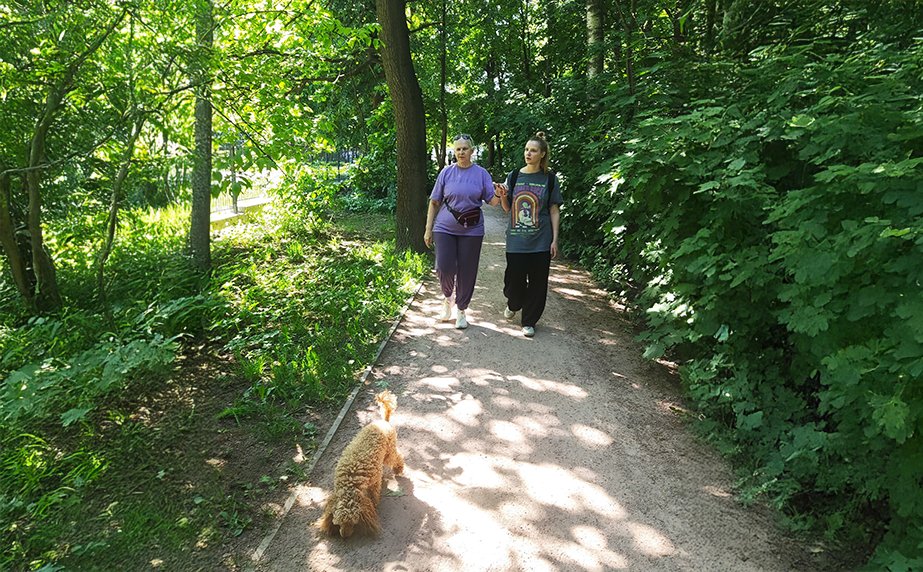 Тифлокомментарий: цветная фотография. Летний солнечный день. По тенистой аллее городского парка, взявшись за руки, идут две женщины: Ирина Поволоцкая в длинной фиолетовой футболке, свободных спортивных брюках и белых кроссовках и девушка в повседневной одежде и обуви. Впереди бежит лохматый палевый пудель.