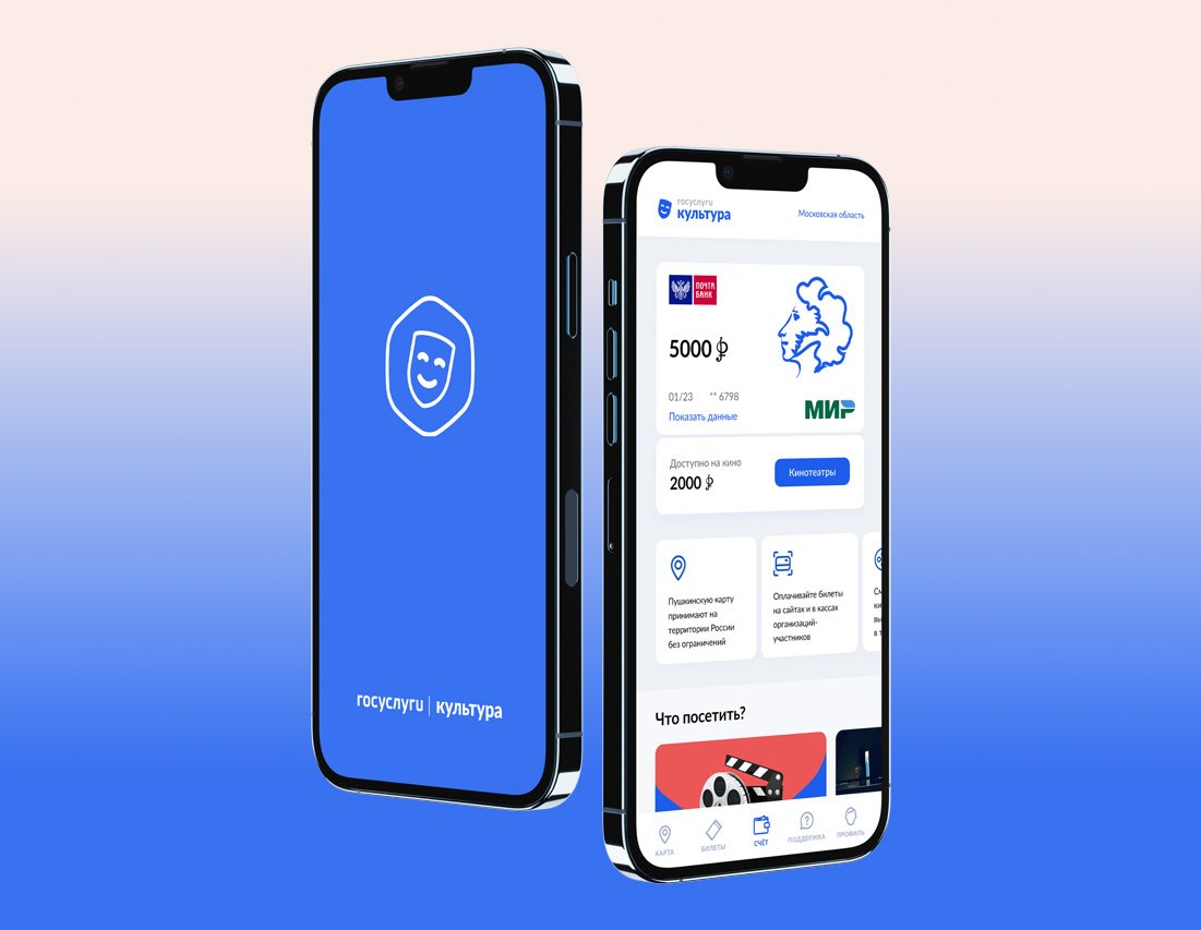 Тифлокомментарий: цветное изображение двух смартфонов на градиентном голубом фоне. На их экранах — интерфейс мобильного приложения «Госуслуги. Культура». На первом — логотип приложения: театральная маска в округлом шестиугольнике на синем фоне. На другом открыта страница программы «Пушкинская карта» с профилем поэта, вкладкой «Кинотеатры», перечнем предстоящих мероприятий и номиналом карты в 5 тысяч рублей.