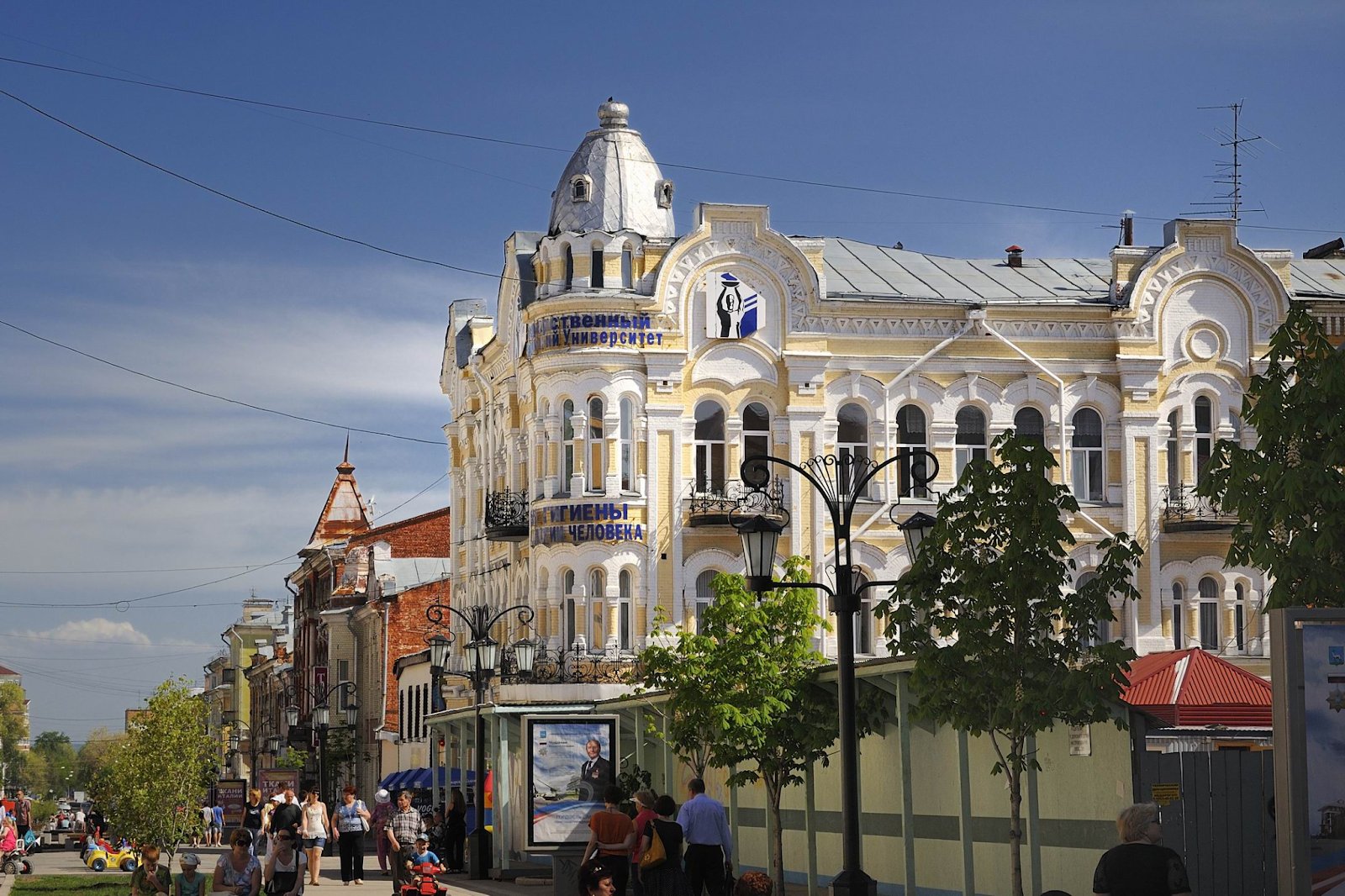 Тифлокомментарий: цветная фотография. Солнечный летний день. Горожане прогуливаются по пешеходной улице Ленинградская с историческими зданиями. Среди них — трехэтажный желтый дом с узкими арочными окнами, щедро декорированный белым орнаментом и увенчанный серым куполом. На фасаде крупная синяя надпись «Государственный медицинский университет».