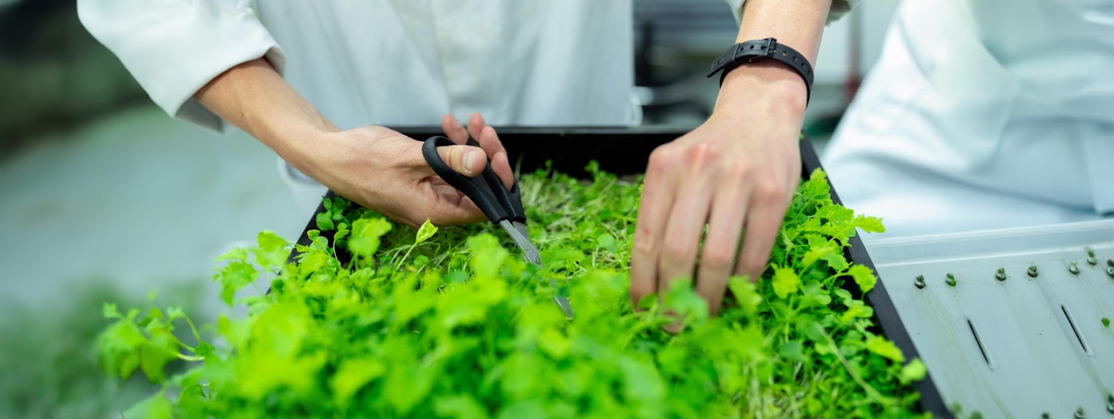 Тифлокомментарий: цветная фотография. На светлом деревянном столе стоит несколько небольших черных лотков с пышной микрозеленью. Один из пластиковых лотков перевернут вверх дном, на нем лежит пластина питательного субстрата с тонкими ростками. Кто-то срезает молодые побеги под корень красными ножницами.