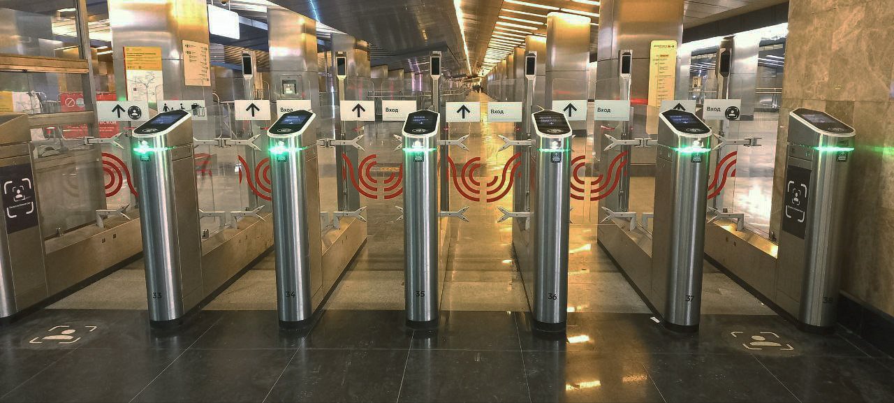 Тифлокомментарий: цветная фотография. В вестибюле метро стоят шесть серебристых турникетов со стеклянными дверцами с возможностью оплаты карточками и по биометрическим данным, то есть лишь одним взглядом в камеру.