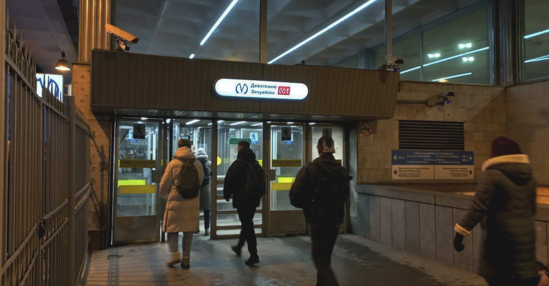 Тифлокомментарий: цветная фотография. Осенний вечер. Горожане в теплых одеждах заходят в метро. Над стеклянными дверьми висит белое светящееся табло с синим логотипом метрополитена Петербурга в виде округлой буквы М и синими надписями «Девяткино» на русском и английском языках.