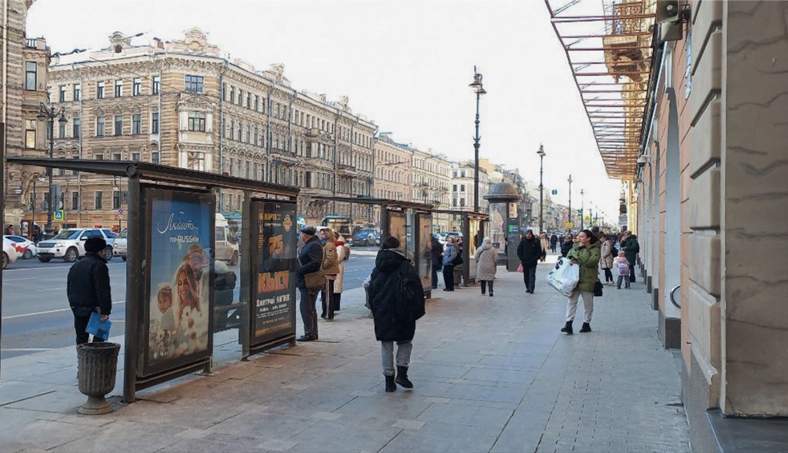 Тифлокомментарий: цветная фотография. Ясный осенний день в Петербурге. На улице с историческими зданиями горожане снуют по тротуарам и ожидают транспорт на остановках с разноцветными афишами.