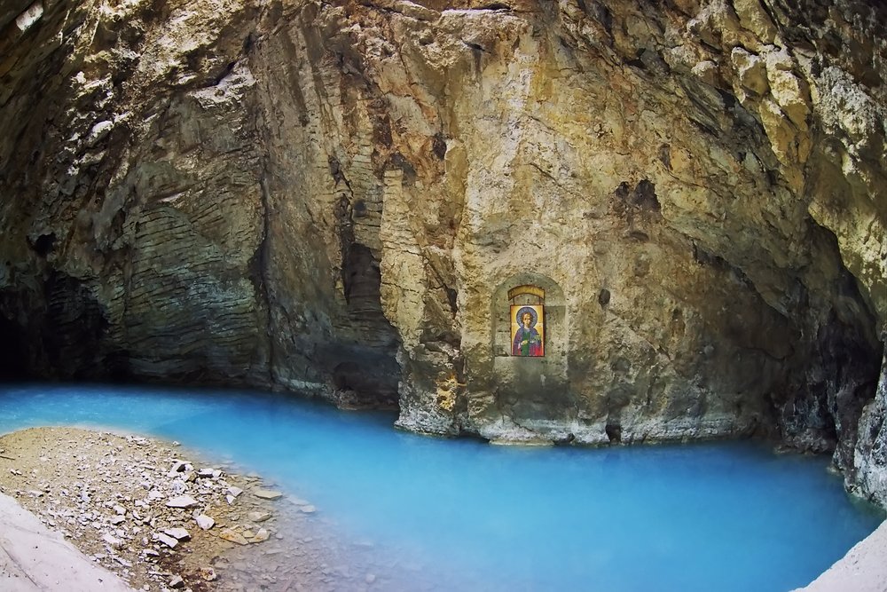 Тифлокомментарий: цветная фотография. Маленькое озеро с ярко голубой водой окружено высокими отвесными скалами. На дальней скале в искусственно вырубленной небольшой арочной нише установлена икона святого великомученика и целителя Пантелеймона. Это озеро Провал.