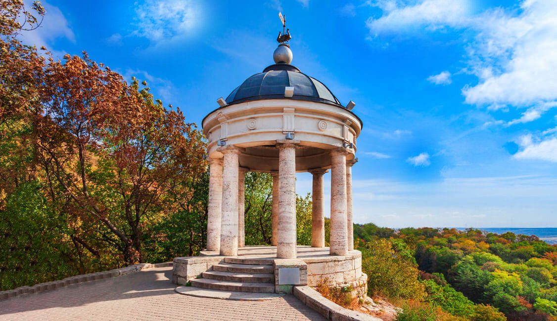 Тифлокомментарий: цветная фотография. Солнечный осенний день. Над горными склонами, сплошь покрытыми деревьями с разноцветной листвой, стоит круглая белокаменная беседка, построенная в античном стиле. Серый купол с флюгером в виде арфы опирается на восемь изящных колонн. Пространство в беседке ничем не заполнено, площадь перед ней вымощена брусчаткой.