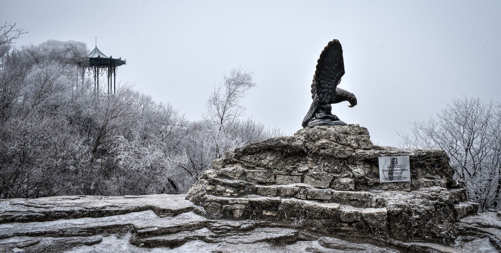 Стоит орел на смотровой площадке, он повернут в сторону Пятигорского собора и парка «Цветник».
