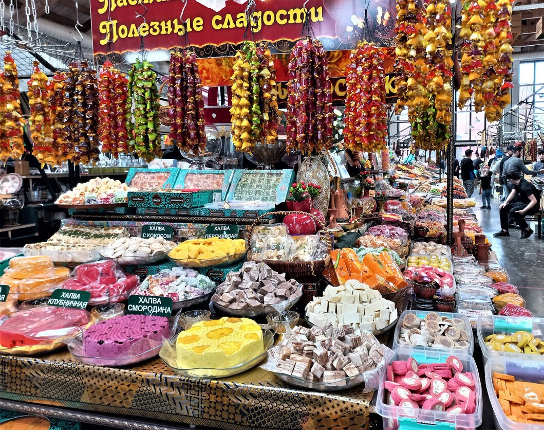 Тифлокомментарий: цветная фотография. Покупатели ходят между торговых рядов на крытом рынке с высокими панорамными окнами. На переднем плане прилавок с подвешенными на крючки связками разноцветной чурчхелы и в три ряда заставленный большими стеклянными блюдами с разнообразной халвой. Над прилавком красная прямоугольная табличка с желтой надписью «Полезные сладости».