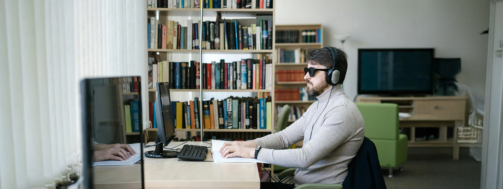 Тифлокомментарий: цветная фотография. Молодой человек с серой кофте едет на кресле-коляске по современному офису в стиле опенспейс со стенами из необработанного красного кирпича и белыми металлическими стеллажами. Его силуэт размыт.