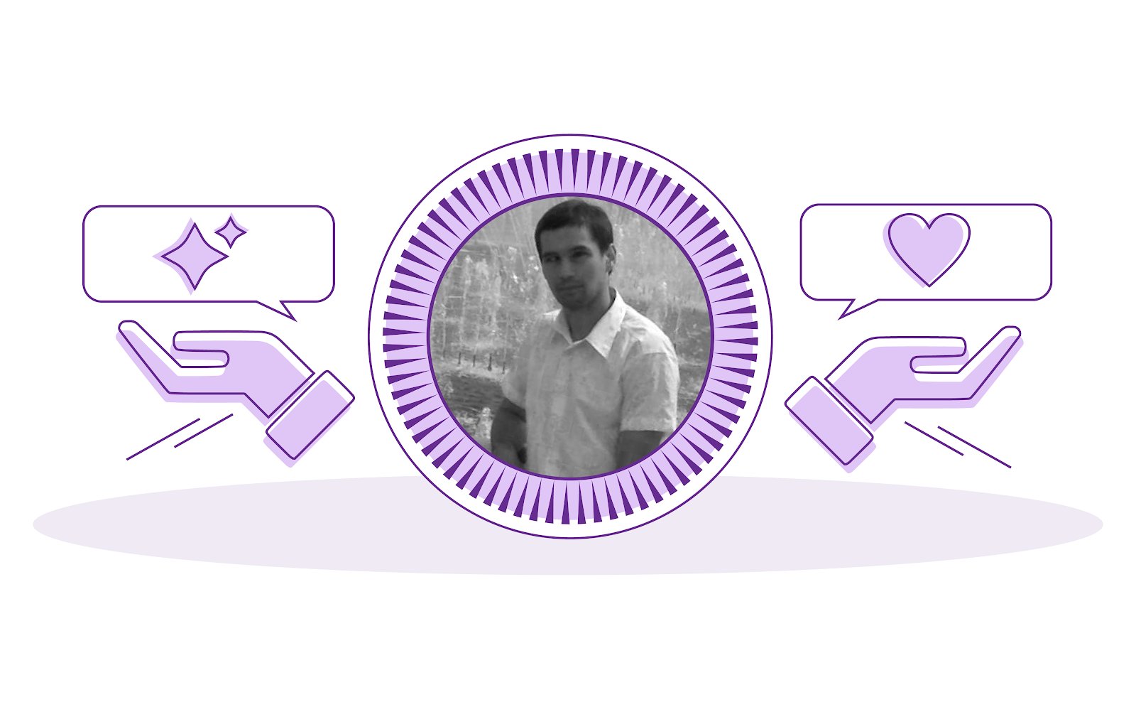 Тифлокомментарий: На фото молодой темноволосый человек с серьезным выражением лица. Его взгляд расфокусирован. Альберт Асадуллин одет в белую рубашку с коротким рукавом, за его спиной бьют струи фонтана. По обе стороны фотографии — рисунок ладони, сложенной ковшиком, над ней звезда и сердце в прямоугольных рамках для прямой речи.