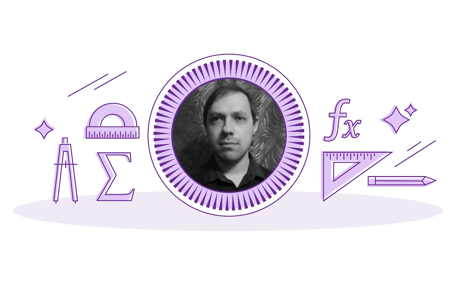 Тифлокомментарии: На фото молодой человек с уверенным целеустремленным взглядом. У него открытый лоб, крупный нос, полные губы. Сергей Кошкин одет в темную рубашку с расстегнутым воротом. По обе стороны от фотографии расположены рисунки предметов и символов, имеющих отношений к математике: линейка- транспортир, треугольник, циркуль, знаки функции и суммы.