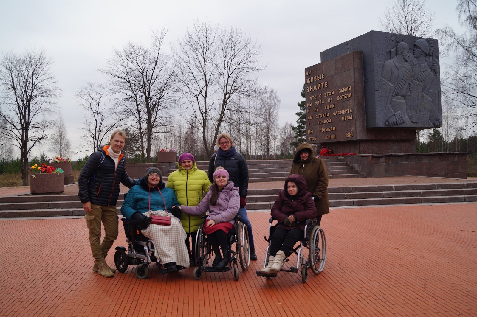 Тифлокомментарий: цветная групповая фотография. Пасмурный день. Семеро человек стоят на площадке у мемориала Великой Отечественной войны, улыбаются. Три девушки в первом ряду в инвалидных креслах. Остальные стоят за ними, среди них Ренат и Надежда. Все одеты в теплые куртки, шапки, у кого-то накинуты капюшоны. Позади группы небольшая лестница и мемориал в форме куба с памятной надписью и барельефом. За мемориалом деревья с голыми ветками, вдалеке хвойный лес.