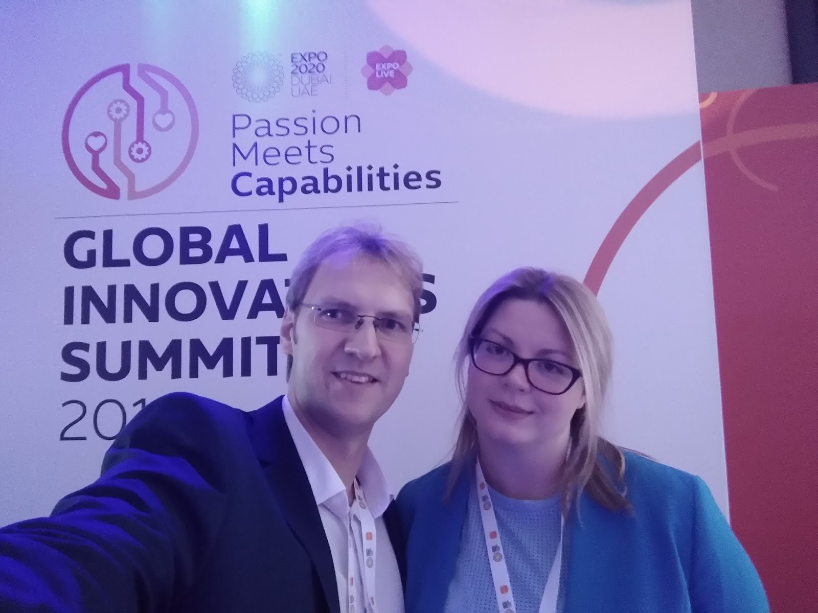 Тифлокомментарий: цветная фотография. Ренат и Надежда делают селфи на фоне белого стенда с логотипами и черной надписью на английском: «Глобальный инновационный саммит. Стремление встречает возможности». Ренат в синем пиджаке и белой рубашке, Надежда в голубом пиджаке поверх голубой кофты. Оба в очках, слегка улыбаются.