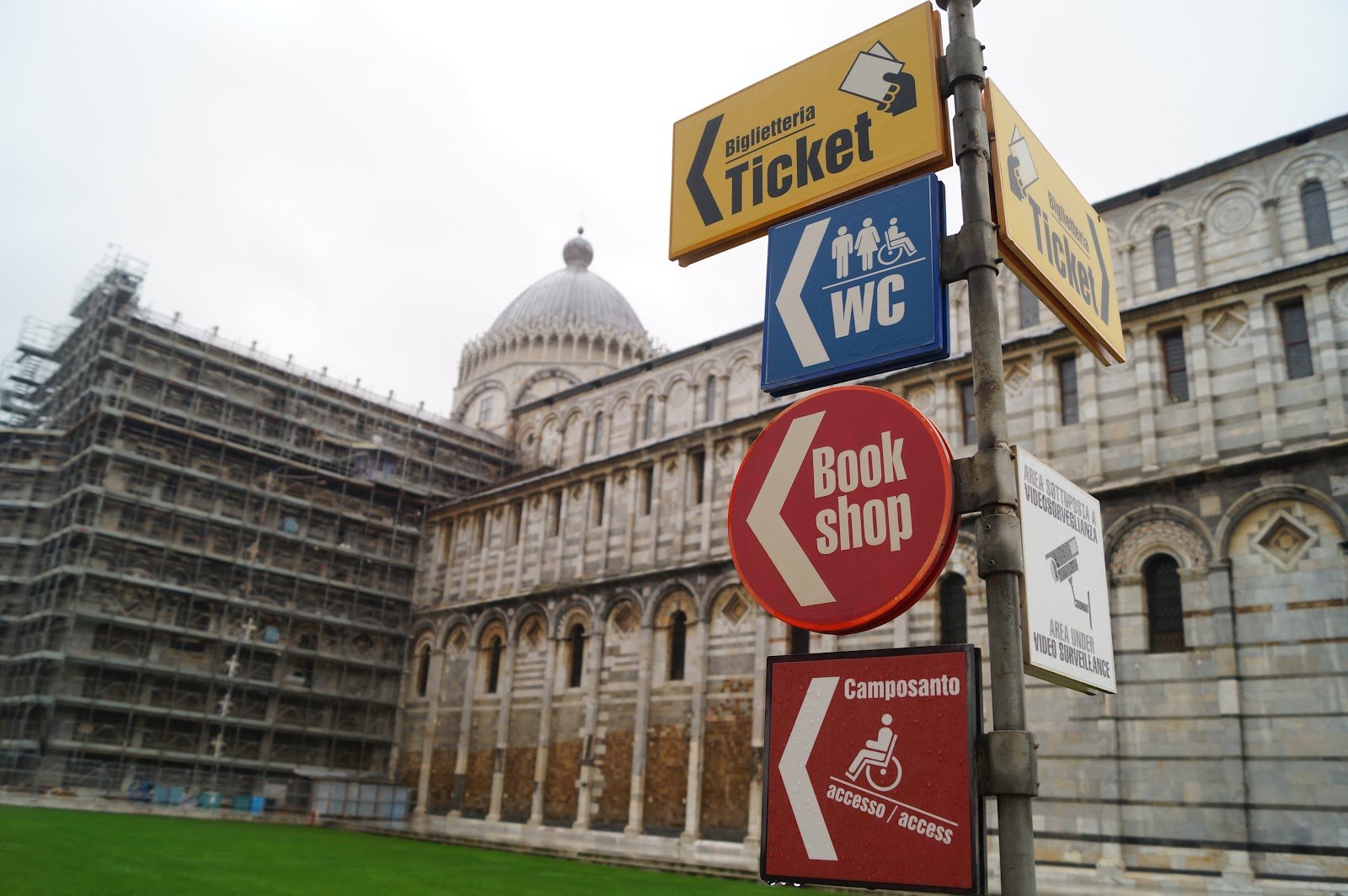 Тифлокомментарий: цветная фотография. Пасмурный день. У Пизанского собора стоит столб с цветными указателями: касса, туалет, книжная лавка, некрополь Camposanto. На указателях «Туалет» и «Некрополь Camposanto» схематическое изображение человека в инвалидной коляске. Часть трехъярусного собора закрыта строительными лесами.