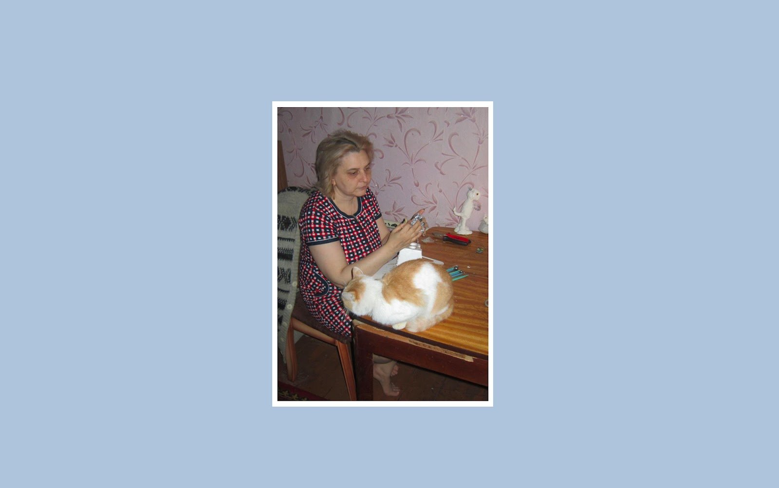 Тифлокомментарий: цветная фотография в широкой голубой рамке. Елена Леквинадзе сидит за деревянным полированным столом и что-то мастерит. Это женщина средних лет со светлыми волосами до плеч в домашнем клетчатом платье с коротким рукавом. Взгляд Елены расфокусирован. Обеими руками с аккуратным зеленым маникюром она формирует каркас из фольги для будущей куклы. На краю стола, мордой к хозяйке, примостился бело-рыжий кот.