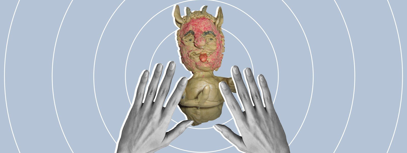Тифлокомментарий: цветной коллаж на голубом фоне. Над открытой ладонью расположен бюст персонажа, похожего на тролля, из желтого пластичного материала. У него непропорционально маленькие ручки и большая голова с отростком на макушке и треугольными вытянутыми ушами. Образ завершают три неровных зуба, массивные надбровные дуги и мешки под круглыми ярко-голубыми глазами.