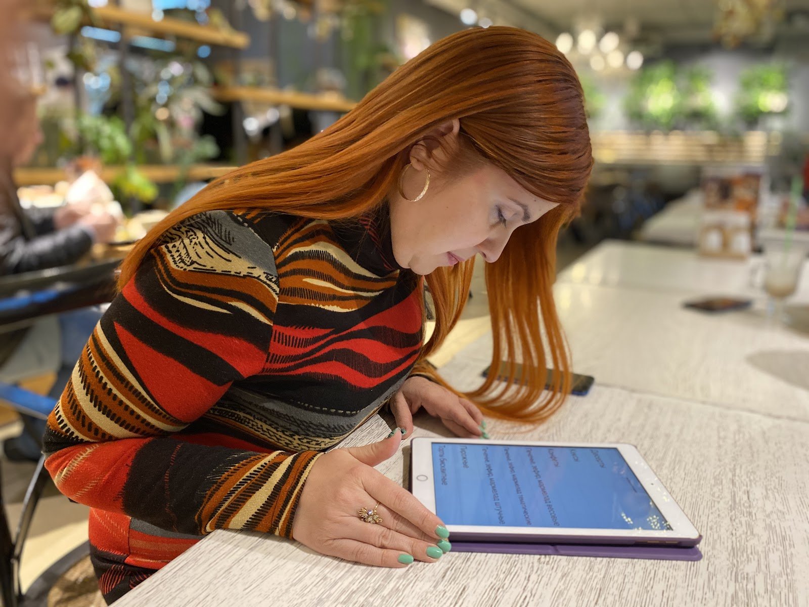Тифлокомментарий: цветная фотография. Молодая женщина с рыжими волосами сидит за столиком кафе. Она склоняется над планшетом, лежащим перед ней.