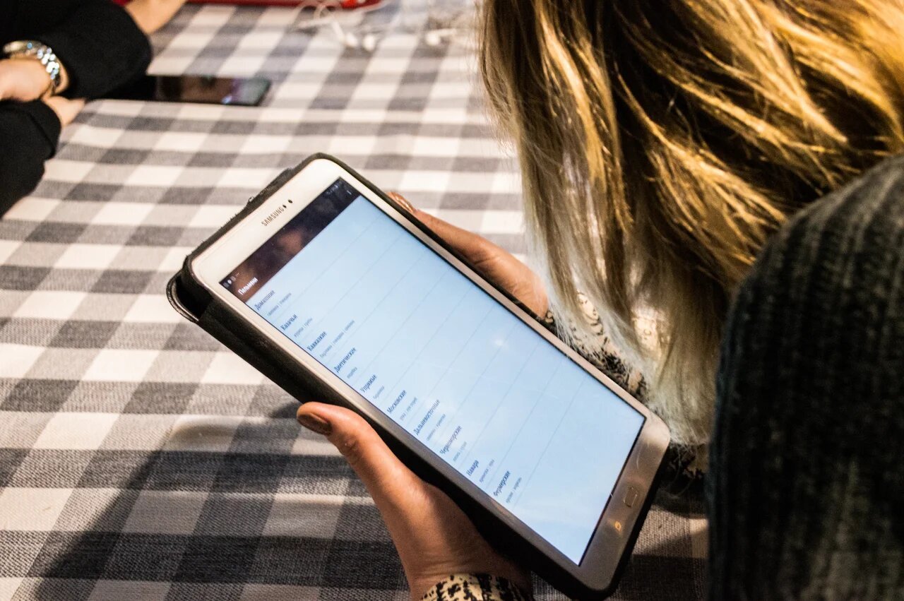 Тифлокомментарий: цветная фотография. Женщина с планшетом в руках за столиком кафе. На экране планшета — меню на белом фоне.