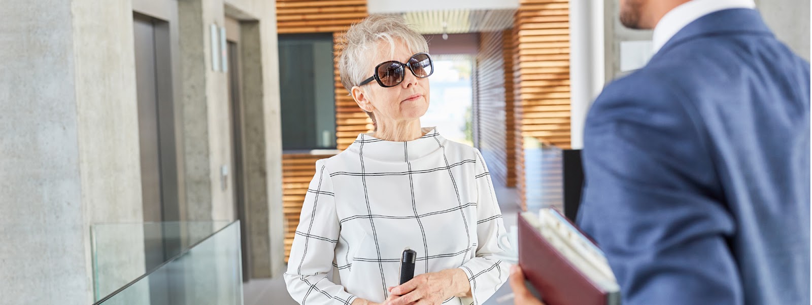 Тифлокомментарий: цветная фотография. Вид снизу на двух мужчин в открытом лифте. Оба одеты в деловые костюмы. Один из мужчин — с белой тростью и в темных очках — выходит из лифта, второй — позади него, говорит по телефону.