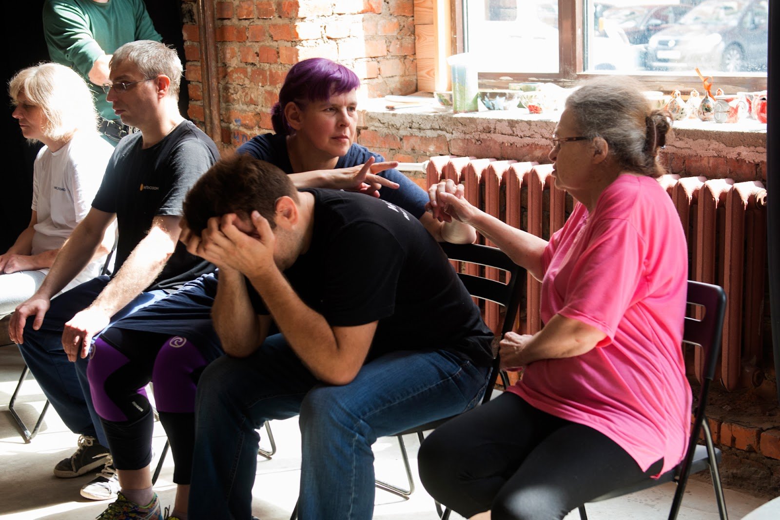 Тифлокомментарий: цветная фотография. В репетиционном зале у окна выставлены в ряд пять стульев. На них сидят двое мужчин и три женщины в повседневной одежде. Среди них Ирина Поволоцкая. Ее фиолетовые волосы собраны в низкий пучок. Она что-то увлеченно дактилирует в руку седовласой соседке слева. Сидящий между ними брюнет упирается локтями в колени, закрывает лицо руками. Двое других, короткостриженый русый мужчина в очках и блондинка средних лет, облокачиваются на спинки стульев. Стены помещения из необработанного красного кирпича.