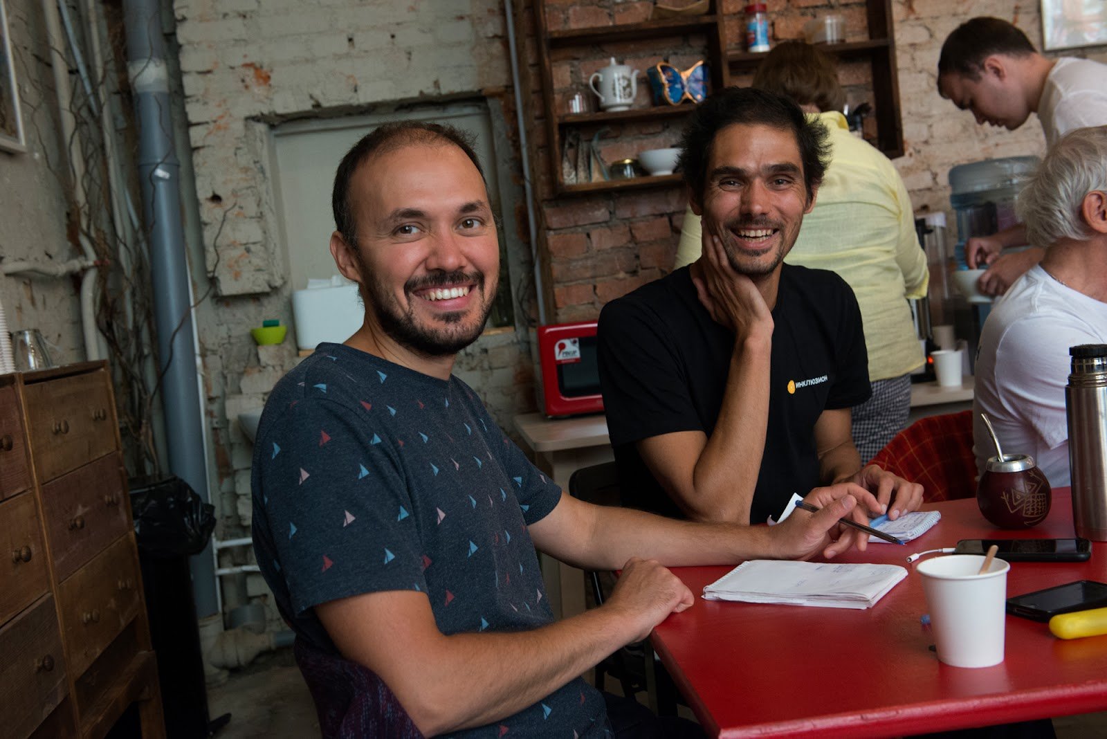 Тифлокомментарий: цветная фотография. Туфан Имамутдинов и Марсель Нуриев сидят за столиком в комнате отдыха, широко улыбаются. Каждому лет по тридцать пять. Оба темноволосые, смуглые, худощавые, с короткими бородами, в темных футболках. Перед ними на красном столике лежат блокноты, ручки, смартфоны, стоят стаканчики с горячими напитками. Стены помещения кирпичные.