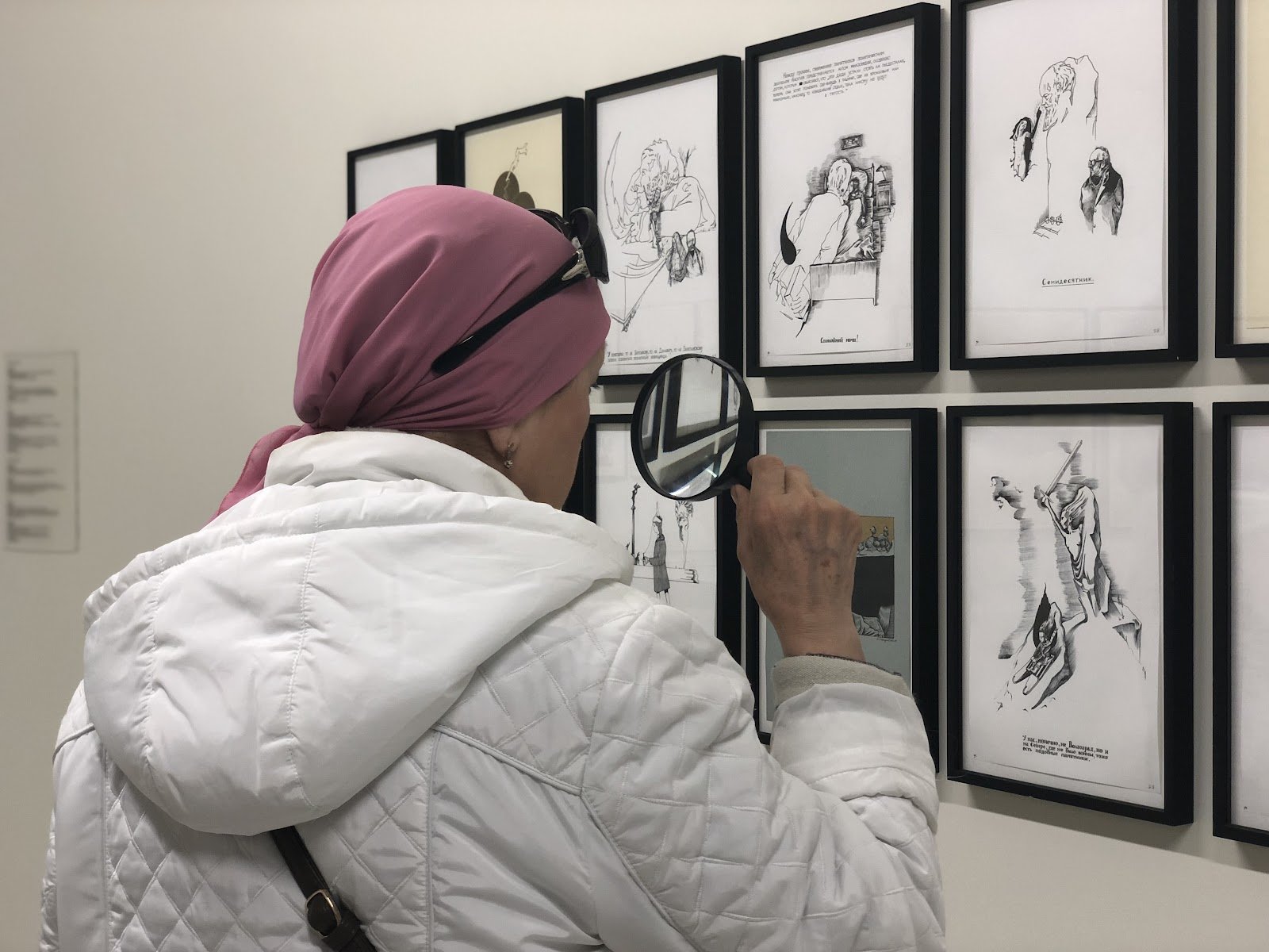 Тифлокомментарий: цветная фотография. Посетительница выставки стоит спиной к нам. Она рассматривает черно-белые иллюстрации Павла Пепперштейна через большую лупу. Они висят в два ряда на белой стене в одинаковых темных рамках. Женщина одета в белую демисезонную куртку с капюшоном, на ее голове — розовый платок, завязанный узлом на затылке, поверх платка — темные очки.