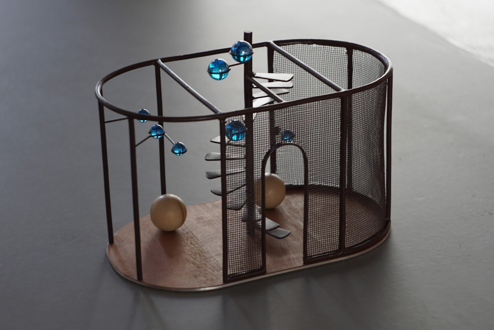 Тифлокомментарий: цветная фотография. Тактильная модель инсталляции с выставки Луиз Буржуа. По периметру овального деревянного основания закреплены восемь вертикальных металлических стержней. Левая половина каркаса затянута металлической сеткой с арочным проемом. Внутри конструкции расположена изящная винтовая лестница. Композицию дополняют шарики разных размеров: два деревянных — внизу, по обе стороны от лестницы, еще семь стеклянных голубых закреплены на боковых опорах.