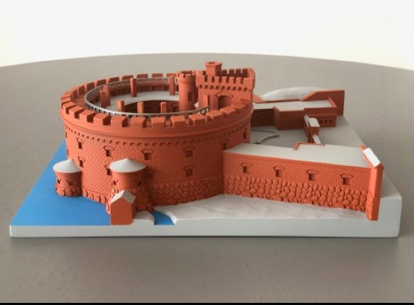 Тифлокомментарий: цветная фотография. Тактильная модель здания Музея янтаря коричневого цвета. Крепостной оборонительный комплекс состоит из круглой двухъярусной башни с зубчатым парапетом и широкой кирпичной стены с амбразурами. Во внутреннем дворе форта возвышается дозорная башня с зубцами. Модель передает фактуру оригинала — кирпичного сооружения с цоколем из крупных булыжников.