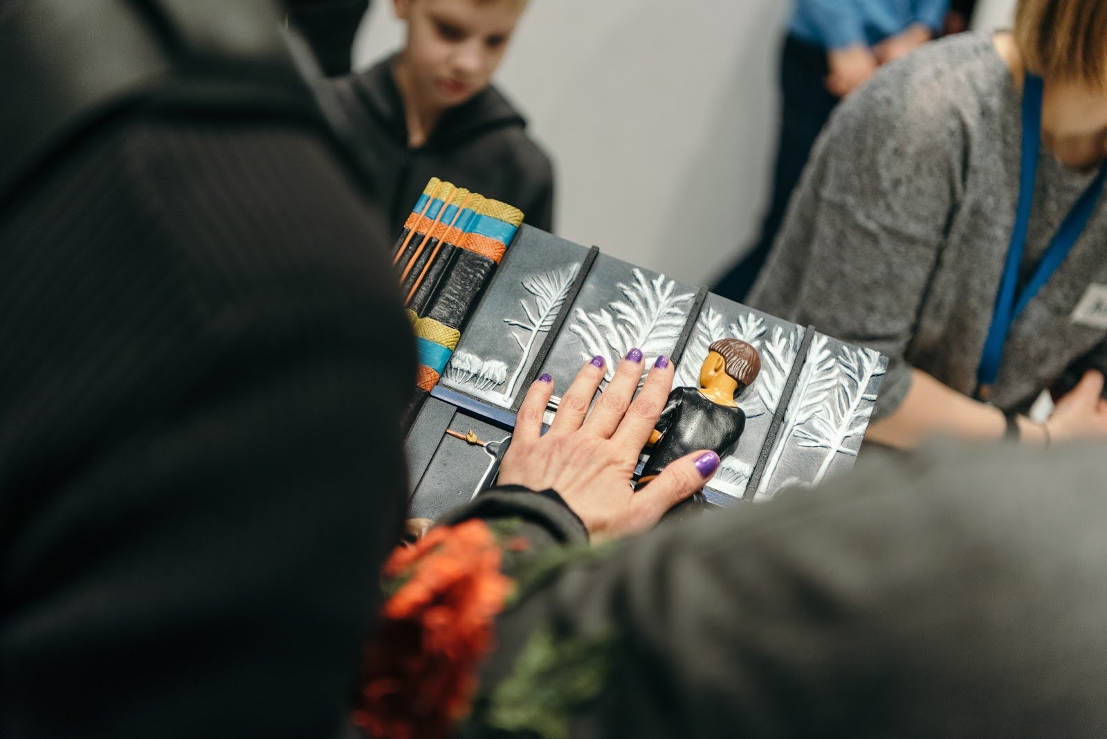 Фото: тактильная выставка на конференции «Музей ощущений», осмотр тактильной модели картины Виктора Пивоварова «Московская готика», Музей современного искусства «Гараж», фотограф Екатерина Краева.