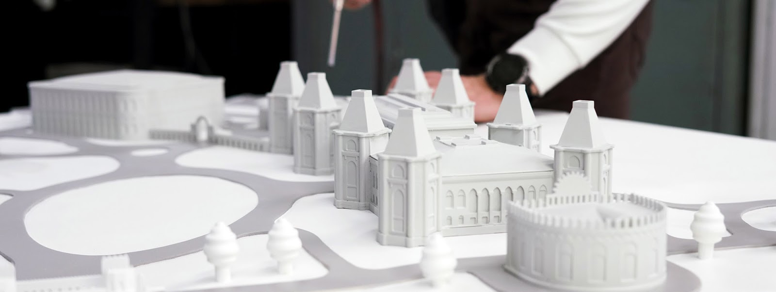 Модель архитектурных объектов лучше сопроводить небольшой фигуркой человечка или каким-то элементом, который будет показывать масштаб здания. Также будет полезно показать примеры материалов, из которых построено здание. Например, кирпич, черепица, фрагмент камня, декоративный предмет убранства в натуральную величину. Если планируется изготовить тактильную модель архитектурного объекта вместе с ландшафтом, то элементы ландшафта (например, дорожки) лучше выделить тактильно и с помощью контраста.
