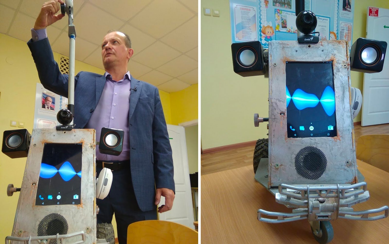 «Привет! Я робот-поводырь. Я готов вам помогать. Назовите номер кабинета, и я помогу вам до него добраться», — говорит синтезированным голосом робот. Он похож на газонокосилку или на алюминиевую призму на колесиках и с длинным рычагом-рукояткой. «Это только опытный экземпляр», — смущается учитель информатики и робототехники Александр Павлов.