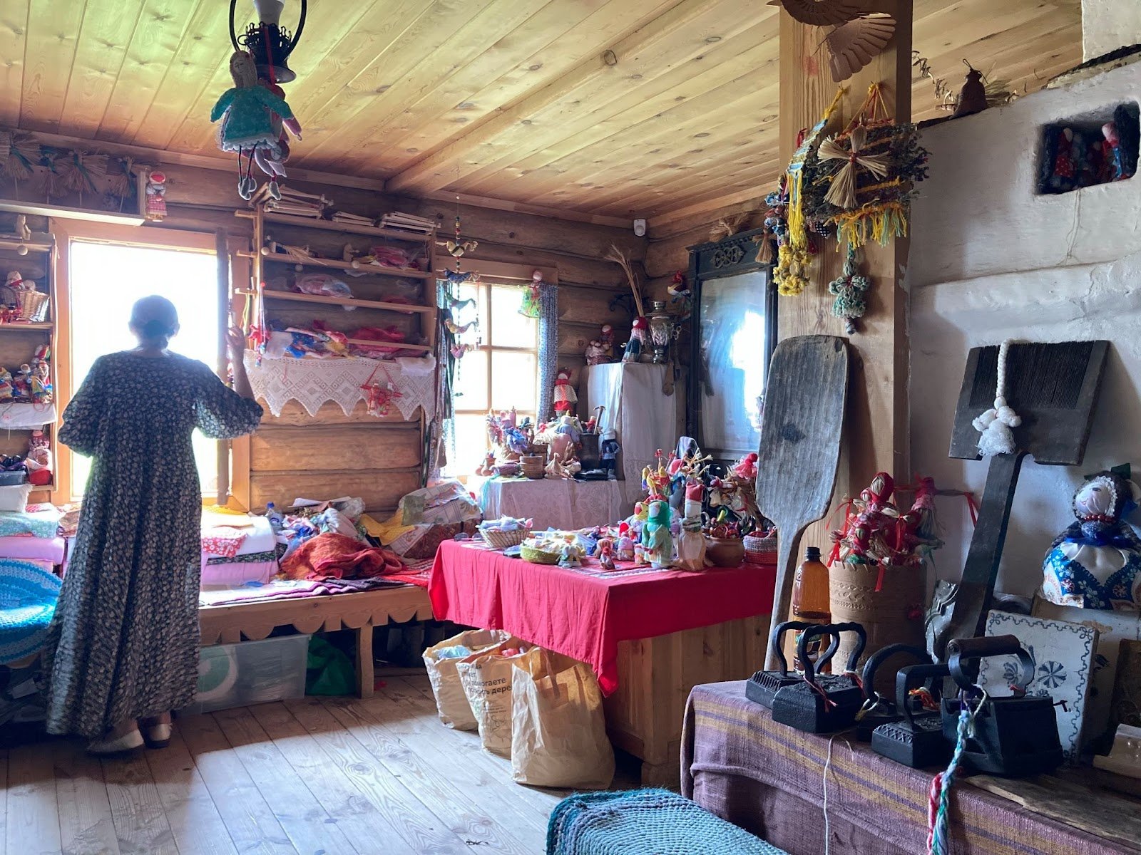 Тифлокомментарий: цветная фотография. Экспозиция внутри русской избы. Столы, резная скамья у окна, полки на бревенчатых стенах заполнены предметами русского быта, игрушками, оберегами. Справа белая печка и деревянная хлебная лопата. У открытого окна спиной к нам стоит женщина в темном длинном платье свободного кроя, волосы забраны в низкий хвост.