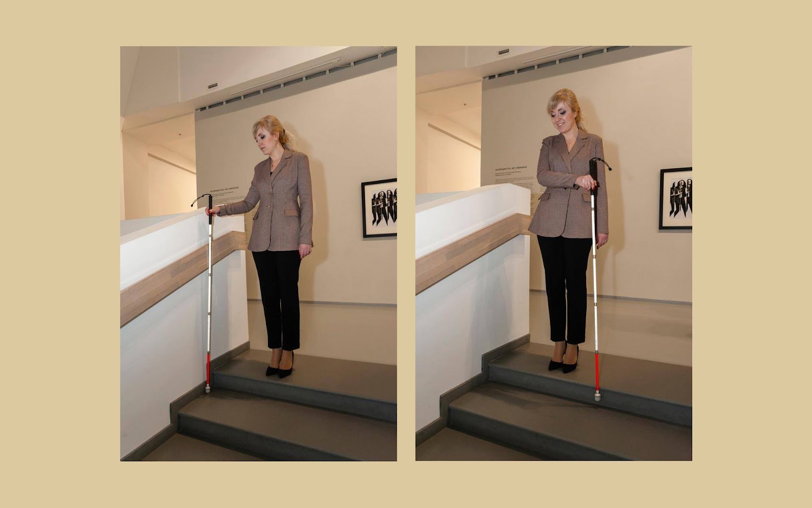 Тифлокомментарий: коллаж из двух цветных фотографий. На обеих фотографиях Марта стоит на первой ступени у правого края лестницы, готовится к спуску. Тростью в правой руке девушка исследует пространство перед собой: на первой фотографии — справа, наконечник при этом касается угла между лестницей и парапетом. На второй фотографии — слева, наконечник касается ребра первой ступени. Руку Марта согнула в локте, трость расположена вертикально.