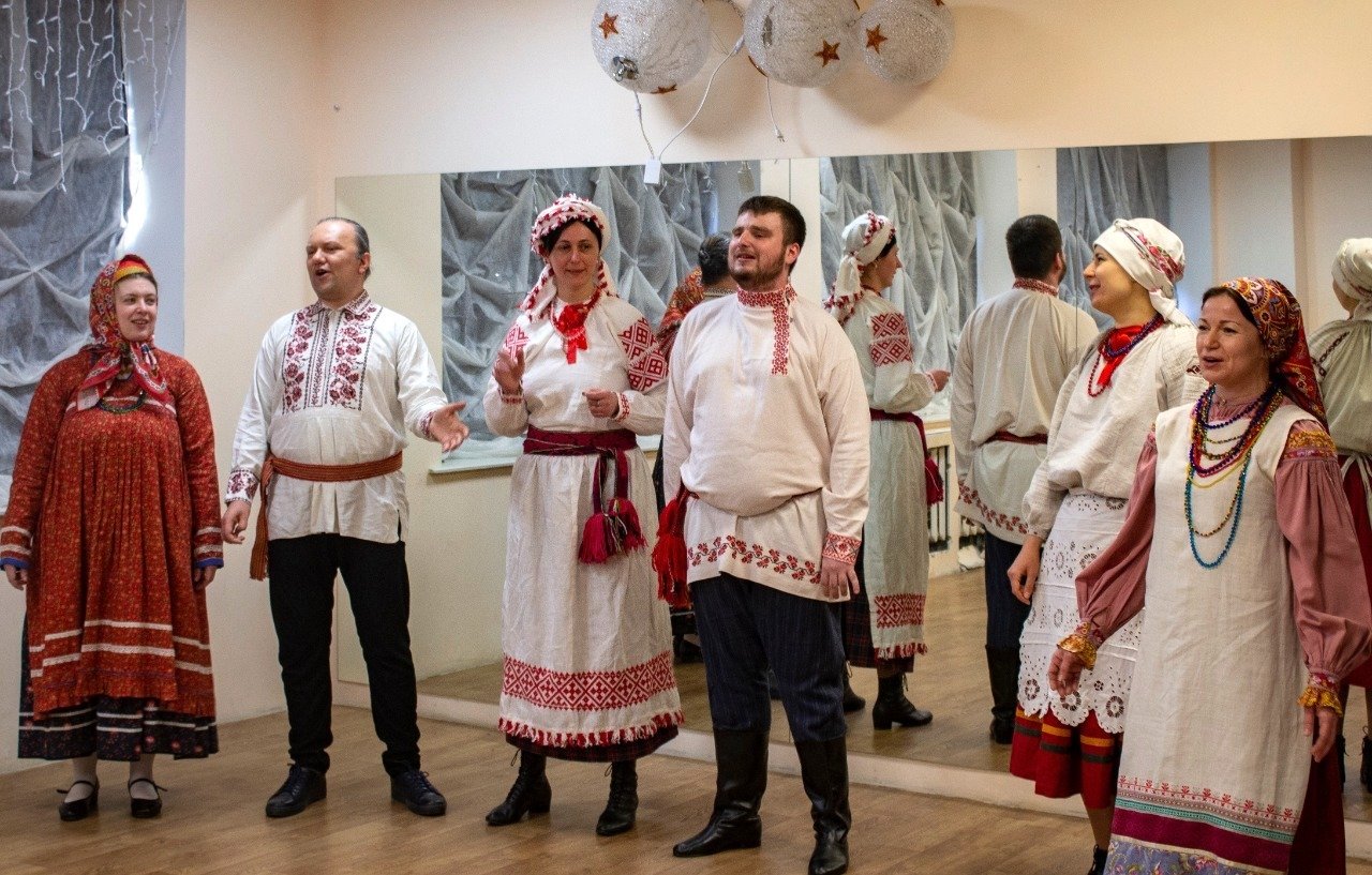 Тифлокомментарий: цветная фотография. Светлый репетиционный зал с высокими окнами. Шесть человек в фольклорных костюмах стоят полукругом, поют. В центре Александр Яшин. На мужчинах белые косоворотки с красным орнаментом, подпоясанные красными поясами с кистями на концах. На женщинах белые и красные сарафаны поверх рубах с народными узорами, крупные бусы, на головах повязаны пестрые платки. Позади них на стене висят зеркала.