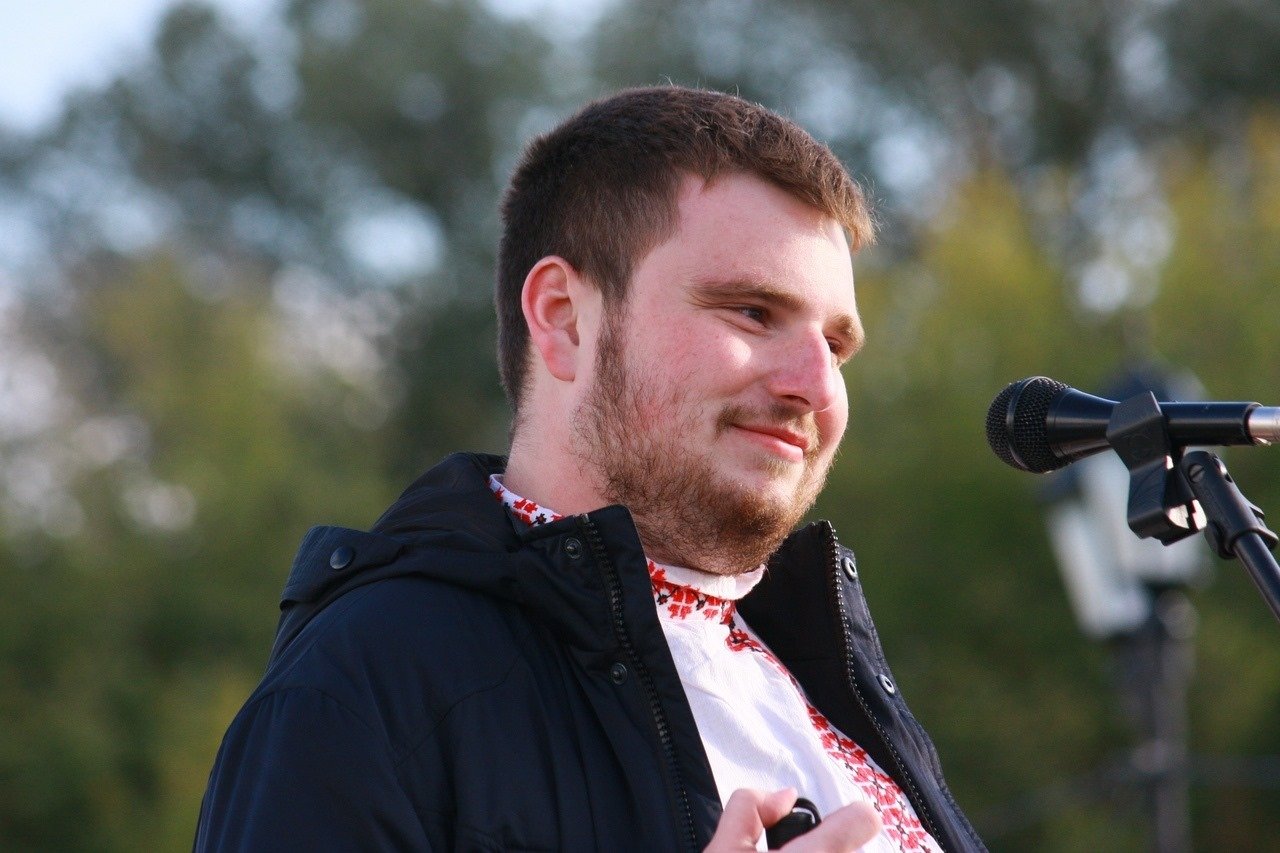 Тифлокомментарий: цветная фотография. Ясный день. Крупным планом Александр Яшин. Он стоит у стойки с микрофоном, улыбается. На нем черная куртка поверх белой косоворотки.