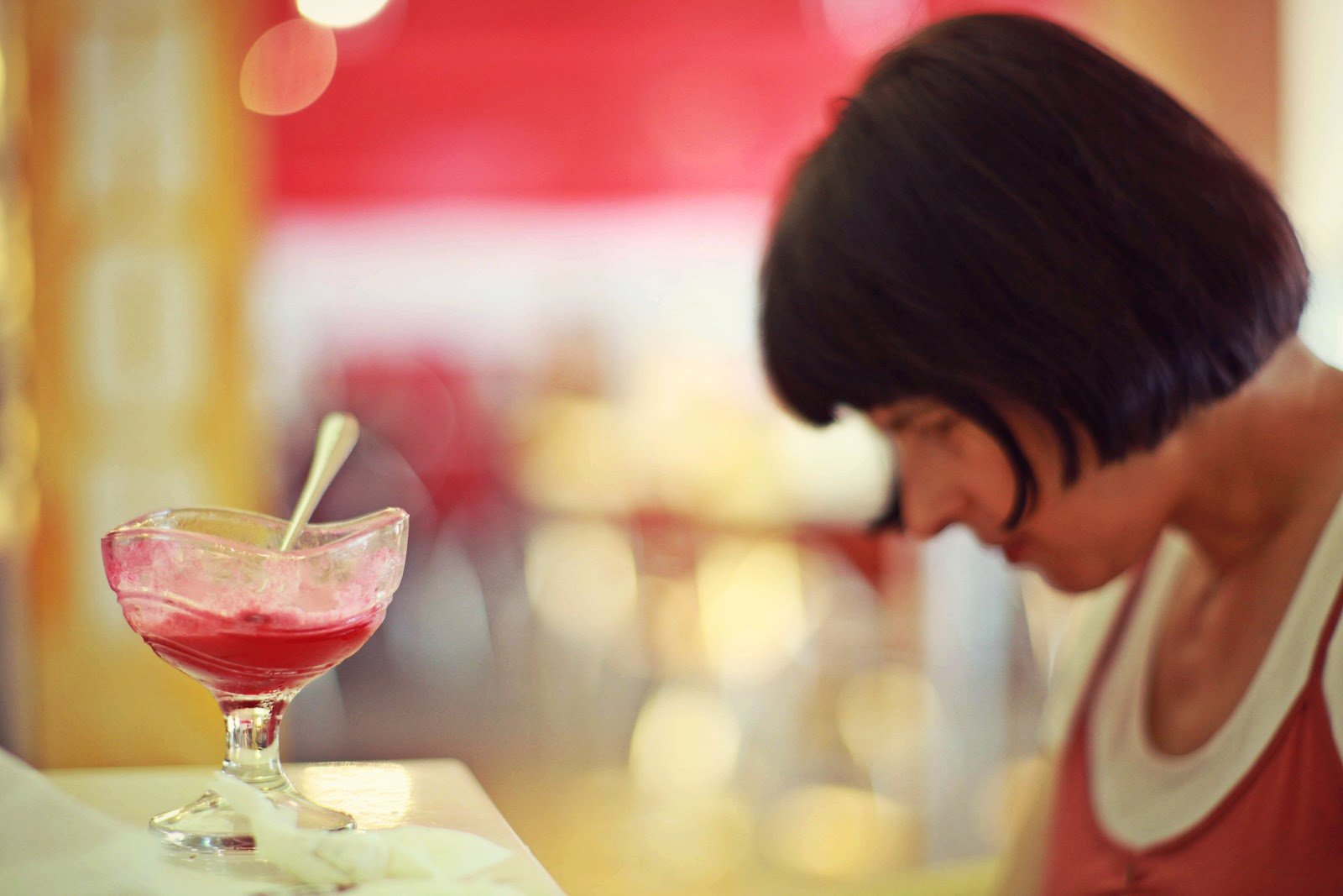 Тифлокомментарий: цветная фотография. Крупным планом Ирина в бело-красной кофте. Она сидит перед столиком в кафе, склонив голову. У нее темное каре. На столе стоит креманка с сорбетом. Желтые огоньки и неоновые надписи на заднем фоне размыты.